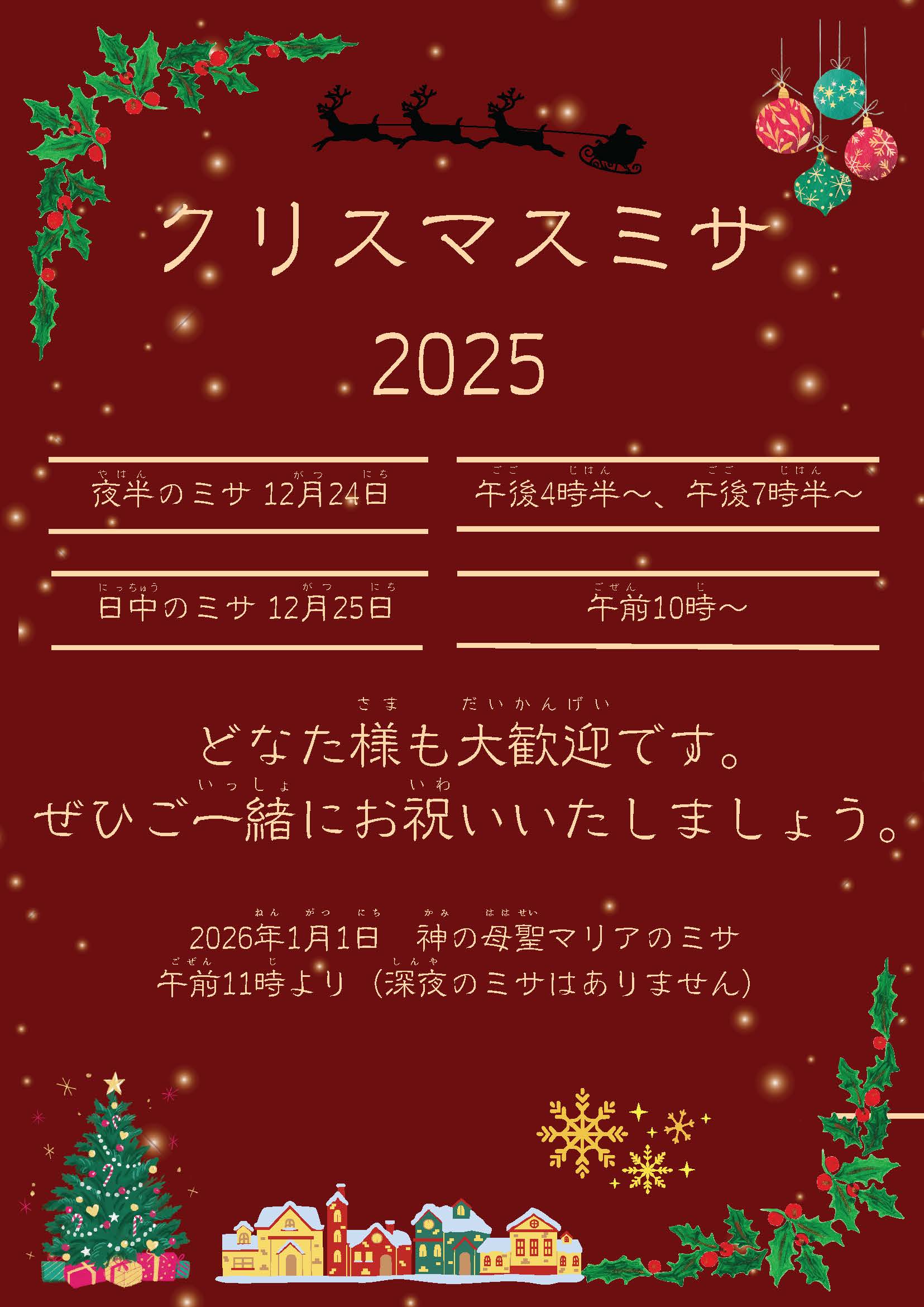 教会のミサは、いつでもどなたでもご参加いただけます。 クリスマスには、普段の日曜日と少し違う特別なミサが行われます。 どうぞお気軽にお立ち寄りください。